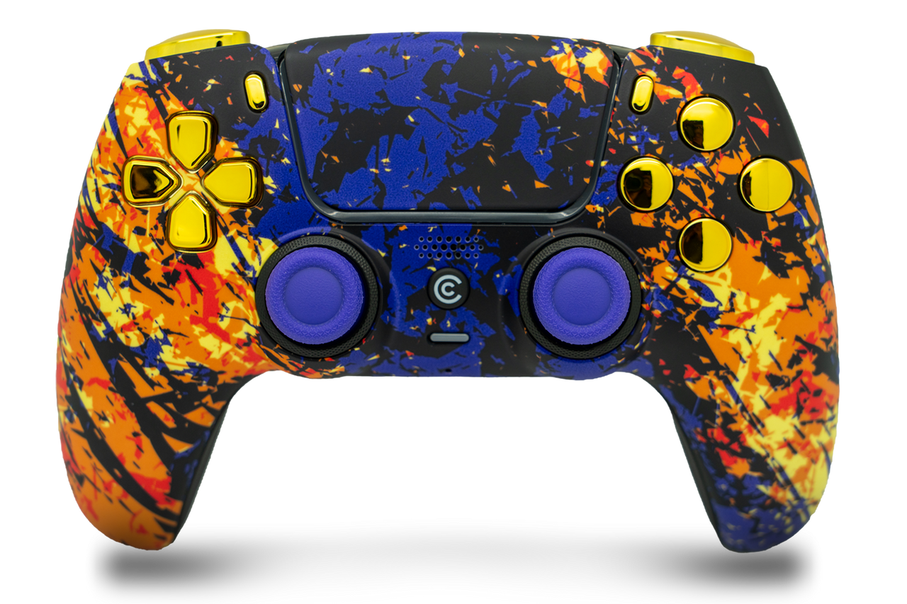 - DOMINATE YOUR GAME: Take your gaming sessions to the next level with Custom Controllerzz Inferno Galaxy & Gold Chrome Inserts Custom Wireless Controller, the ultimate compliment for your PS5 or PC setup.