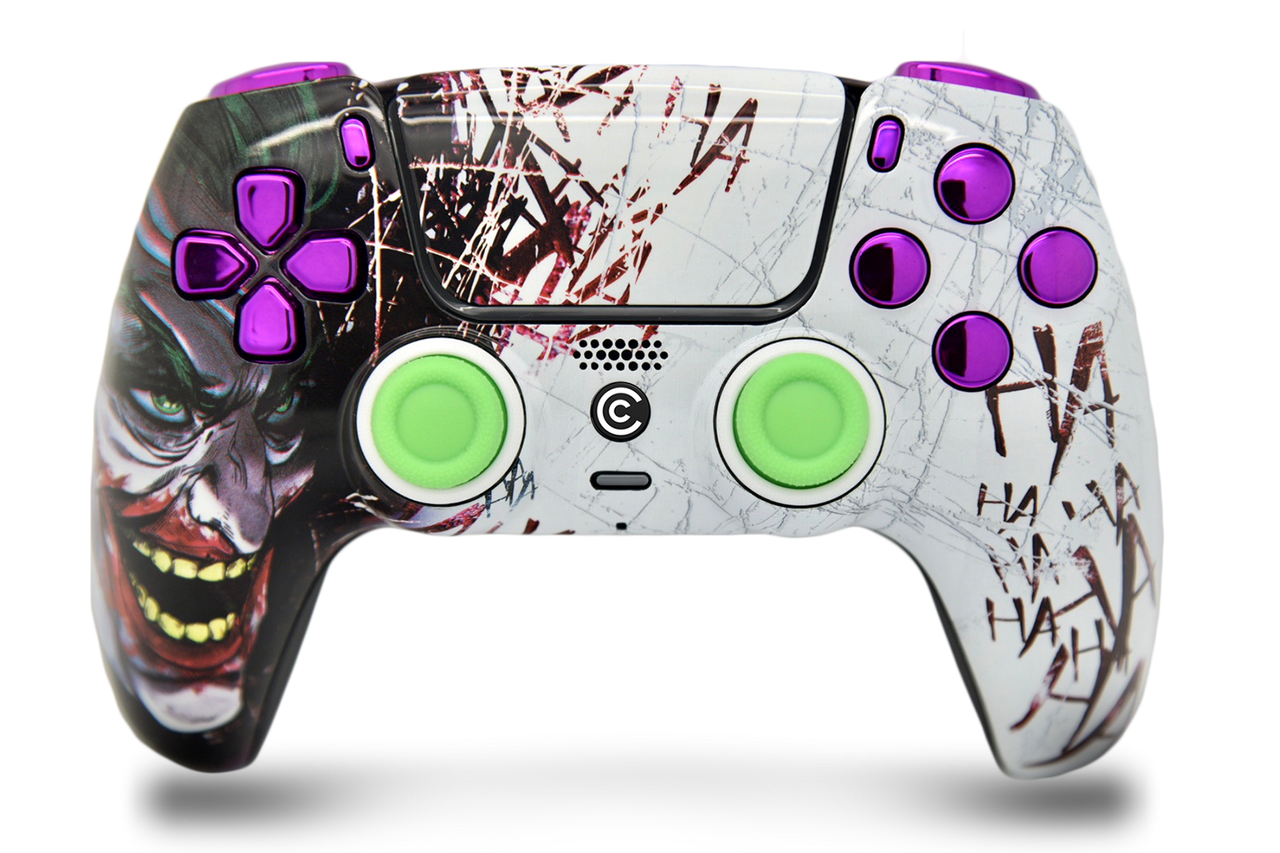 - DOMINATE YOUR GAME: Take your gaming sessions to the next level with Custom Controllerzz Jokester w/ Purple Chrome Inserts Custom Wireless Controller, the ultimate compliment for your PS5 or PC setup.