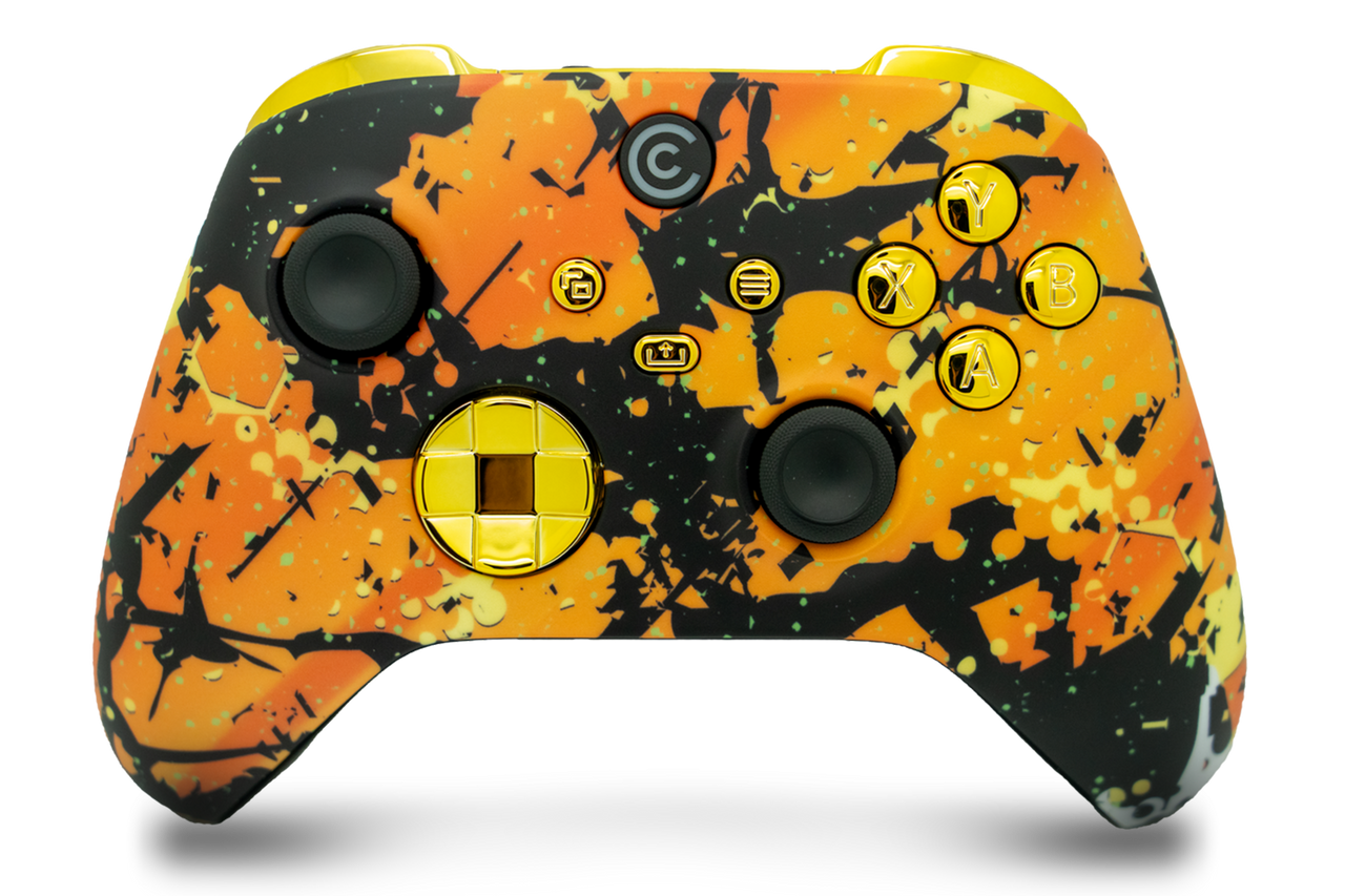 Elevate your gaming setup with the Molten Camo Xbox Series X/S Controller, featuring striking Gold Chrome inserts. Built for Xbox Series X/S, Xbox One, and PC, available exclusively from Custom Controllerzz.