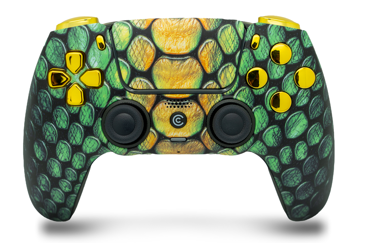 - DOMINATE YOUR GAME: Take your gaming sessions to the next level with Custom Controllerzz Viper Grid & Gold Chrome Inserts Custom Wireless Controller, the ultimate compliment for your PS5 or PC setup.